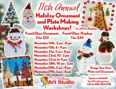 🎄✨ It’s that time again — our 11th Annual Plate and Ornament Making Workshops are here! Come have some creative fun and make sparkly fused glass gifts for teachers, grandparents, aunts, and everyone you love. Don’t forget to craft a special ornament for your own Christmas tree, too! It’s the perfect way to get into the holiday spirit — full of color, laughter, and creativity! Hurry! Spots and glass are limited.