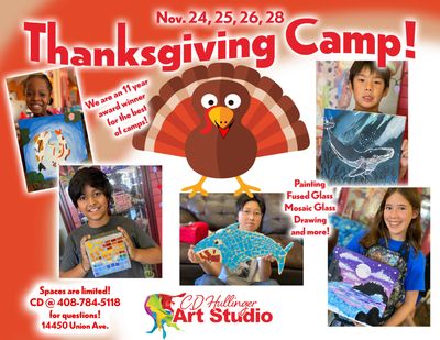 Your kids will be eating up all the art this week at Thanksgiving Art Camp! We’re serving up creativity with projects you won’t find at other studios—like fused glass and glass mosaics! Campers will also enjoy acrylic and watercolor painting, drawing, and so much more. And for our 5–8 year olds, the fun keeps going with lunchtime games and activities!